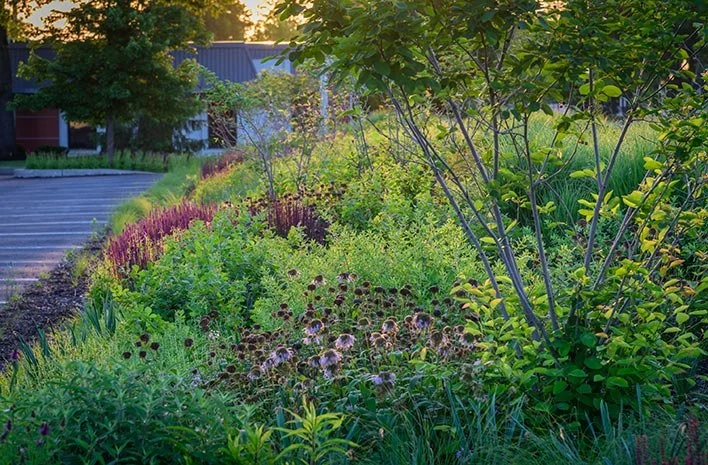 Naturalistic planting employs high-density and layered plant communities that mimic nature to increase ecological function and decrease high-input management over time. Each garden is designed to suite its site condition and microclimate, and utilize native plants as much as possible.