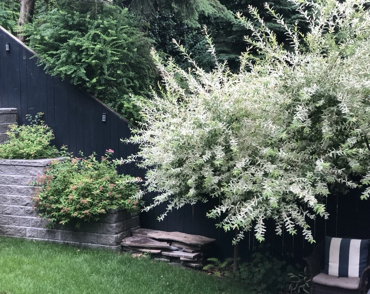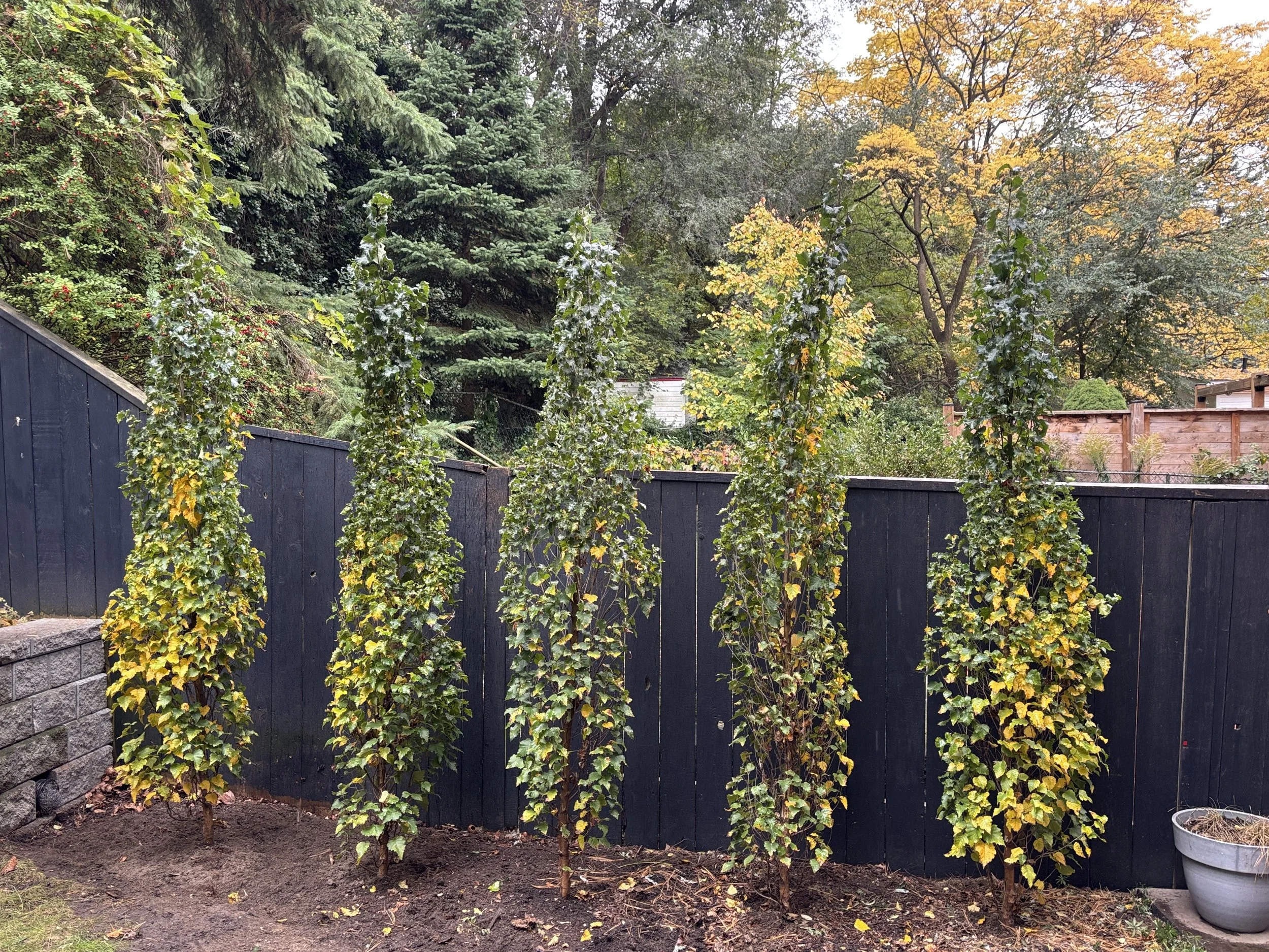 Hybrid columnar trees will grow into each other for form a hedge but the growth is mostly upwards. This hedge will never require trimming to control size. It’s a practical solution when space is limited or access is an issue for pruning.